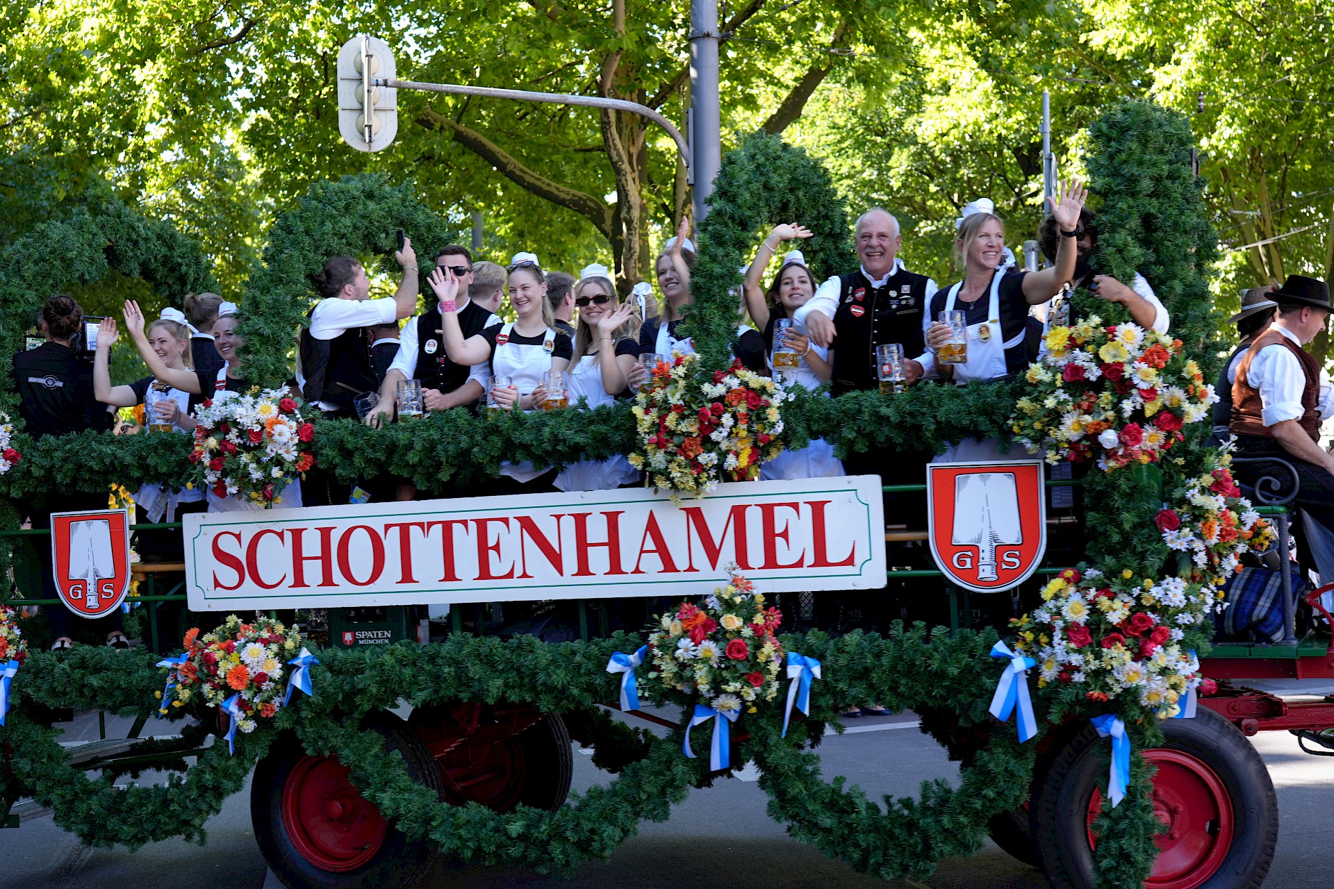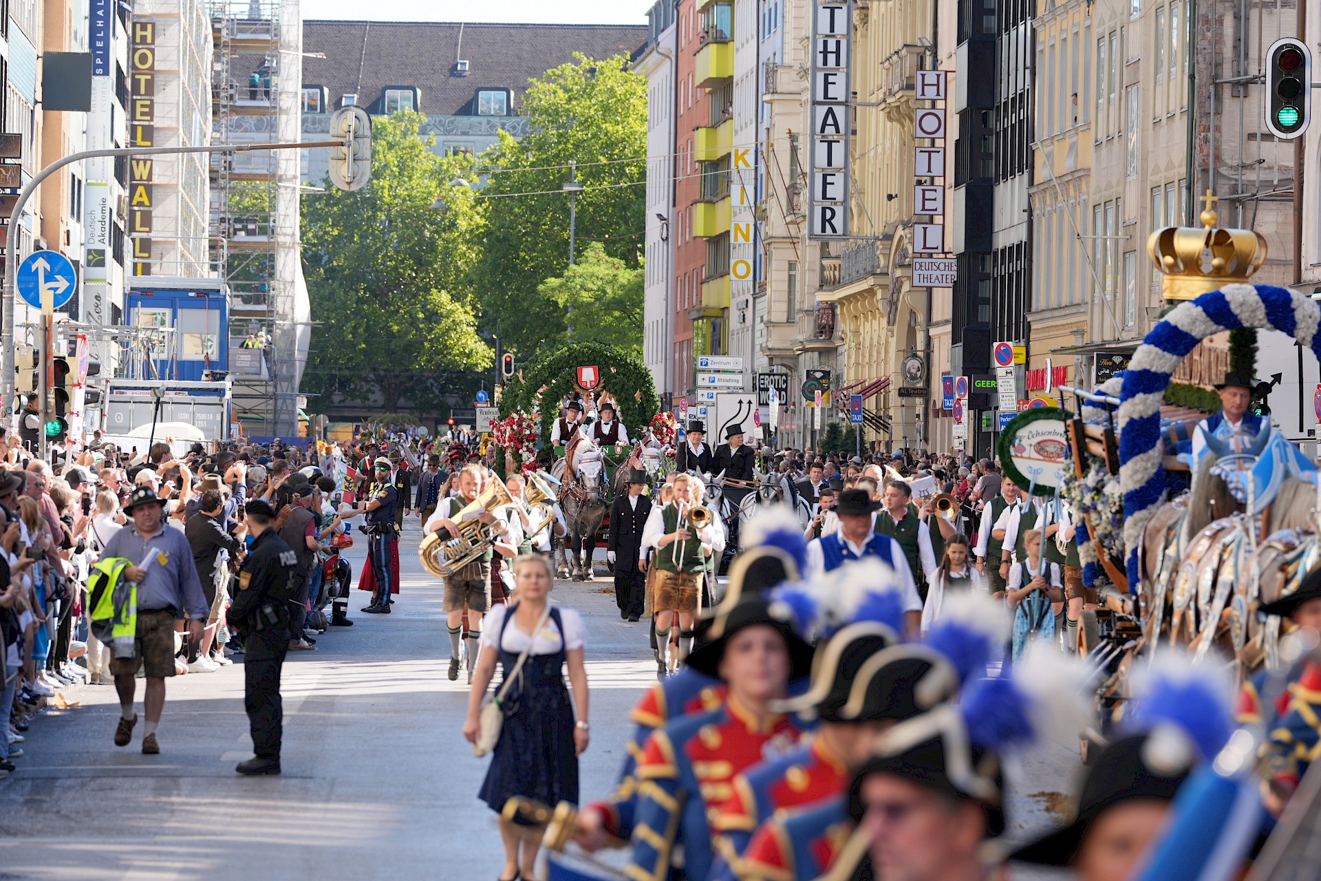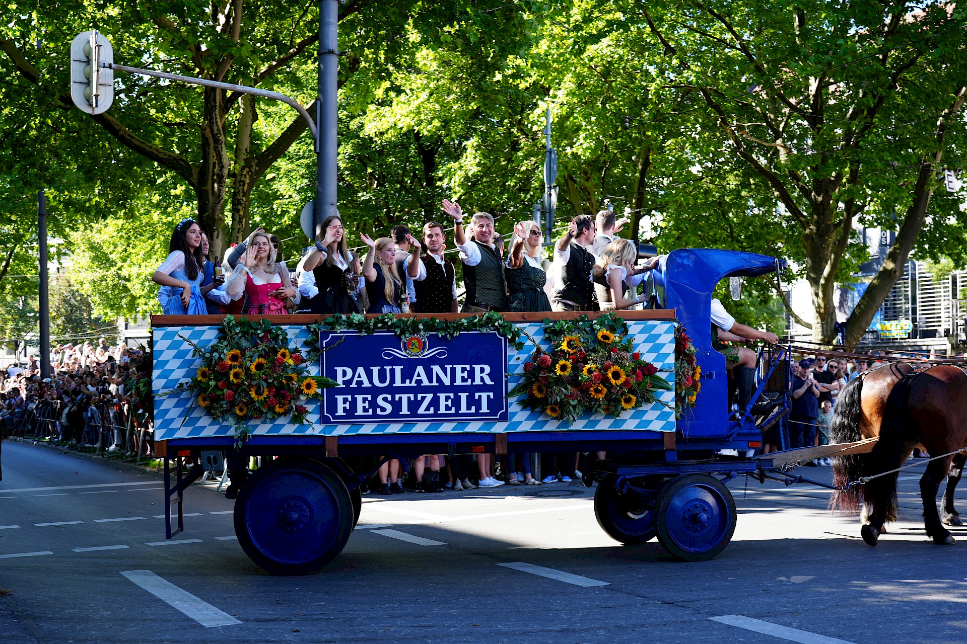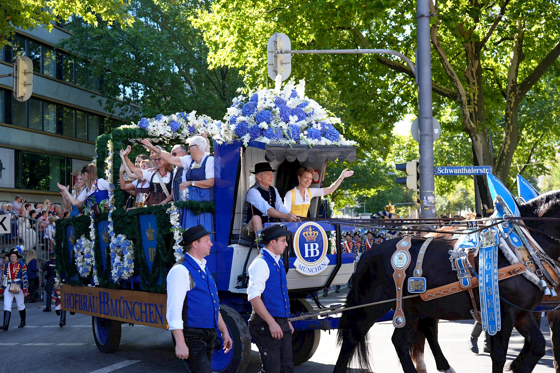Il y a deux ingrédients de l’Oktoberfest essentiels, qui ne sont pas installées sur la Theresienwiese d’avance : Les taverniers et les brasseries. Pour déménager leurs débits de la façon la plus respectable possible, le grand défilé inaugural des taverniers et des brasseries se déroule le samedi inaugural à partir de 10:45 h à la Herzog-Spital-Straße. Le défilé comprend les attelages magnifiquement décorés des six grandes brasseries de Munich, les attelages des taverniers des grandes tentes, des forains, des taverniers des petites tentes, des taverniers de la Oide Wiesn, des fanfares et des Trachtler. Depuis 1935, il est mené par le Münchner Kindl (Enfant de Munich), qui était à l’époque un garçon à un poney, mais est aujourd’hui personnifié par une jeune fille à cheval. Encore plus important est la coche suivante de la famille Schottenhamel, dans laquelle se trouve aussi le maire de Munich, qui ouvre le premier tonneau dans la tente des Schottenhamels.